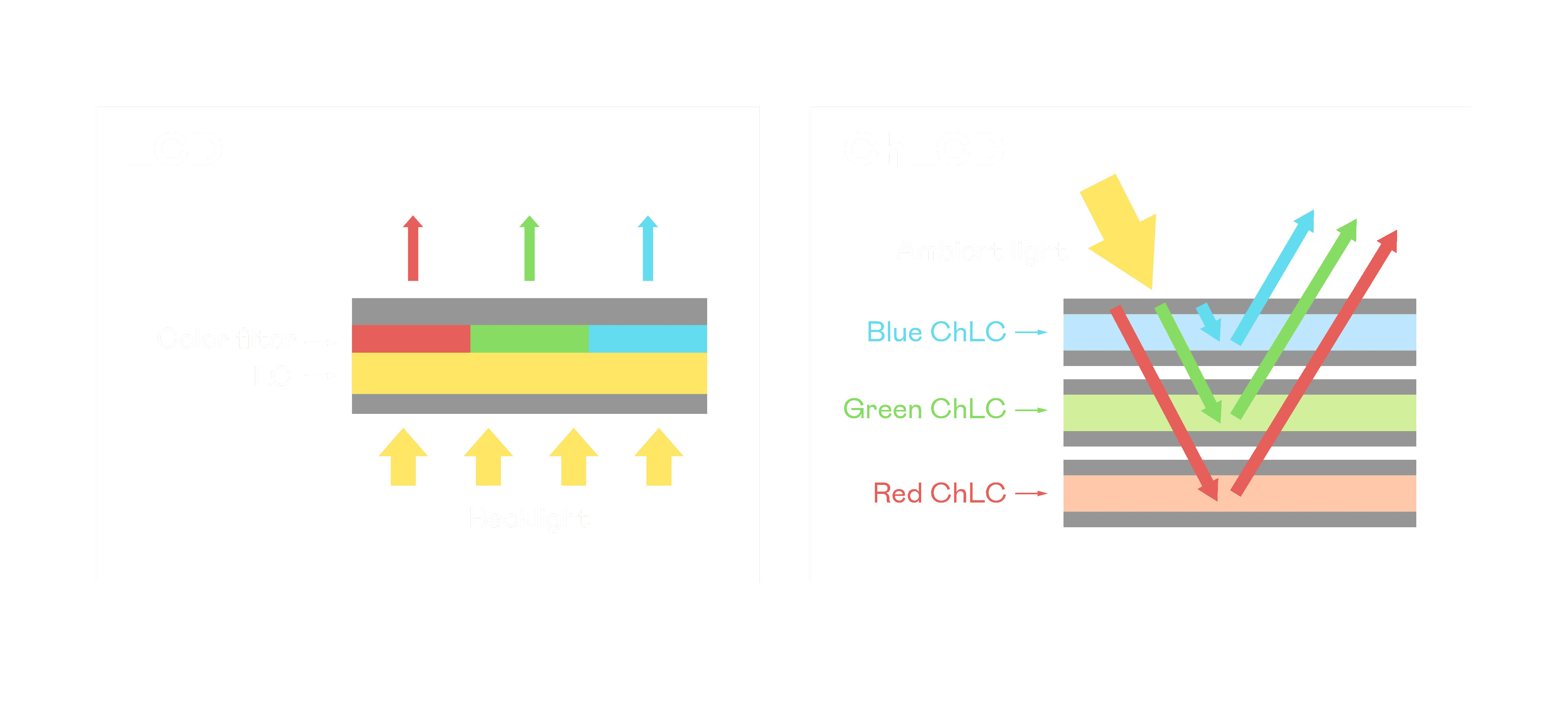 ChLCD 胆固醇液晶就如同纸张一样,,,,透过反射环境光来显示影像,,,因此长时间观看不易造成人眼视觉疲劳,,,,可达到护眼效果。。当处于户外阳光下使用,,,,LCD 影像容易失真而不易观看,,但胆固醇液晶仍可维持较佳的影像品质。。