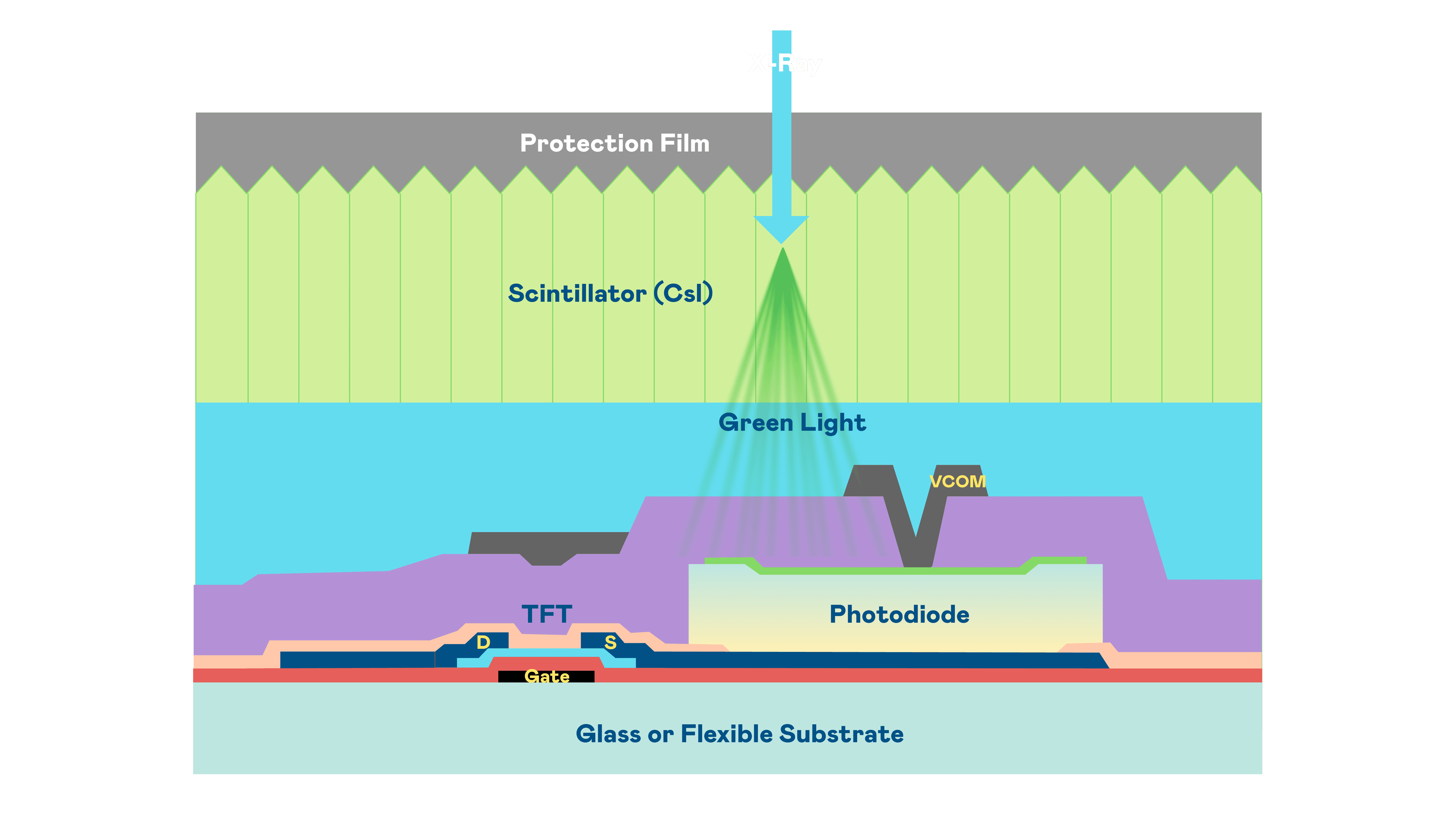 EBpay的X光影像感测阵列使用薄膜电晶体 (TFT) 作为每个像素的读取开关,,搭配光电二极体(Photodiode)的光电转换元件,,用以感测X光影像讯号。。